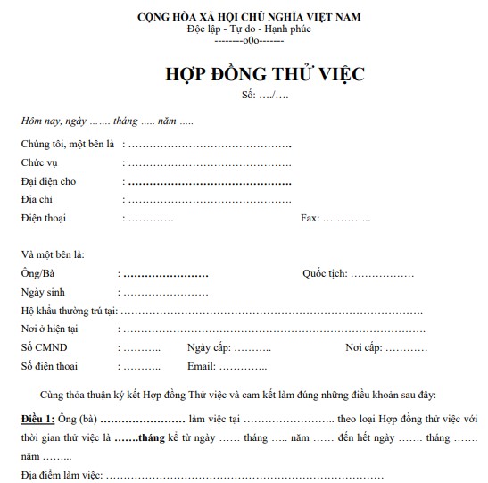 Điều 1: Ông (bà) …………………… làm việc tại …………………….. theo loại Hợp đồng thử việc với thời gian thử việc là ……. tháng kể từ ngày …… tháng ….. năm …… đến hết ngày ……. tháng ……. năm ……...