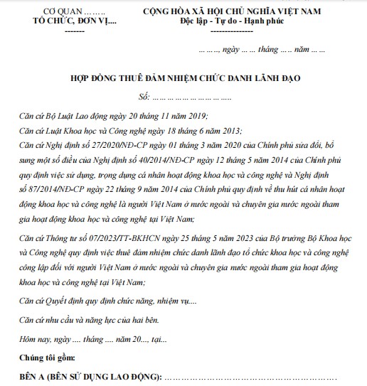 Mẫu hợp đồng thuê đảm nhiệm chức danh lãnh đạo được ban hành kèm theo Thông tư số 07/2023/TT-BKHCN là văn bản hành chính quan trọng, nhằm chuẩn hóa việc ký kết hợp đồng giữa tổ chức và cá nhân được bổ nhiệm vào vị trí quản lý, lãnh đạo.