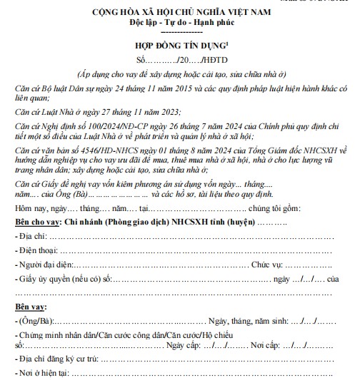 Căn cứ văn bản số 4546/HD-NHCS ngày 01 tháng 8 năm 2024 của Tổng Giám đốc NHCSXH về hướng dẫn nghiệp vụ cho vay ưu đãi để mua, thuê mua nhà ở xã hội, nhà ở cho lực lượng vũ trang nhân dân; xây dựng hoặc cải tạo, sửa chữa nhà ở;