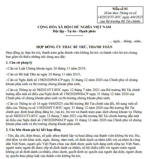 - Căn cứ Thông tư số 14 ngày 04/4/2025 của Bộ trưởng Bộ Tài chính sửa đổi, bổ sung một số điều của Thông tư số 119/2020/TT-BTC ngày 31 tháng 12 năm 2020 của Bộ trưởng Bộ Tài chính quy định hoạt động đăng ký, lưu ký, bù trừ và thanh toán giao dịch chứng khoán và Thông tư số 58/2021/TT-BTC ngày 12 tháng 7 năm 2021 của Bộ trưởng Bộ Tài chính hướng dẫn một số điều của Nghị định số 158/2020/NĐ-CP ngày 31 tháng 12 năm 2020 của Chính phủ về chứng khoán phái sinh và thị trường chứng khoán phái sinh.