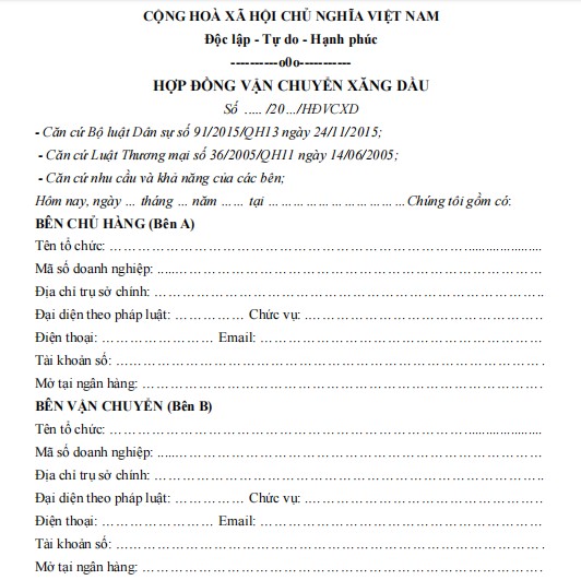 Hợp đồng vận chuyển xăng dầu Biểu mẫu thỏa thuận vận chuyển xăng dầu