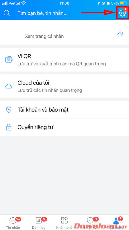 Để bật tính năng xác thực 2 yếu tố trên Zalo, đầu tiên các bạn cần đăng nhập vào app Zalo trên điện thoại. Ở giao diện chính, nhấn chọn vào nút Cá nhân ở góc phải màn hình sau đó chọn tiếp vào nút cài đặt hình bánh răng ở góc trên bên phải.