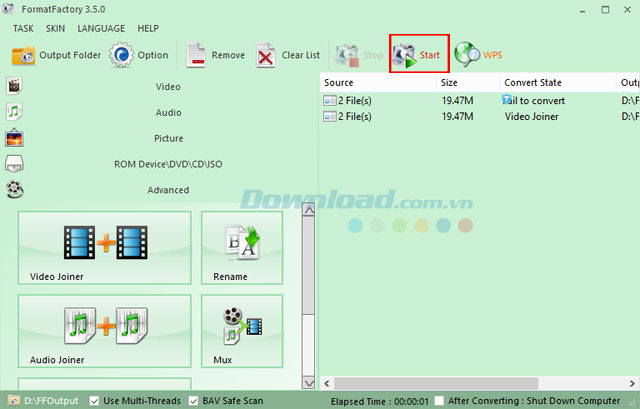 Sau đó, nhấn nút Start để bắt đầu quá trình ghép nối video với nhau. Vậy là bạn đã hoàn tất việc nối 2 video với nhau thành một file duy nhất nhờ ứng dụng Format Factory tuyệt vời này.