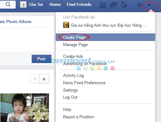 Sau khi đăng nhập xong, click chuột vào menu và chọn Create Page để tạo trang.