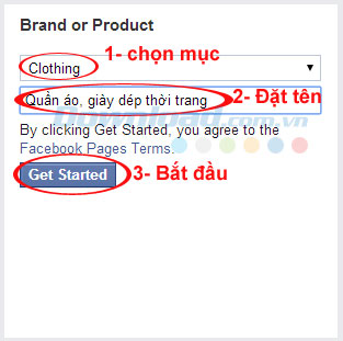 Chẳng hạn, ở đây bạn muốn lập một Fanpage để bán quần áo, giày dép thời trang thì vui lòng lựa chọn Brand or Product. Sau khi nhấp chuột vào Brand or Product, chọn một mục và nhập tên phù hợp, rồi nhấn Get Started để bắt đầu. Vì ở đây, mình muốn lập fanpage để bán quần áo, do đó hãy chọn mục Clothing.