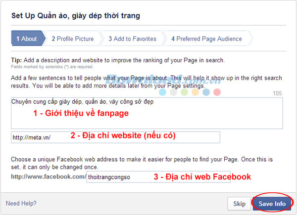 1- Viết lời giới thiệu về fanpage của mình (lưu ý: phần giới thiệu này chỉ dài khoảng 105 từ thôi vì vậy không được nhập quá dài)