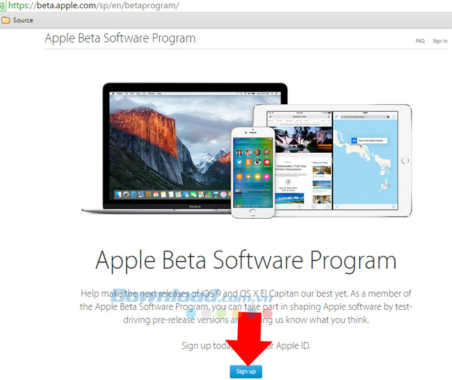 Bước 1: Đầu tiên, các bạn cần đăng ký để tham gia vào chương trình Public Beta iOS 9 của Apple tại địa chỉ này. Sau khi truy cập vào trang chủ, các bạn click vào Sign up ở bên dưới cùng.