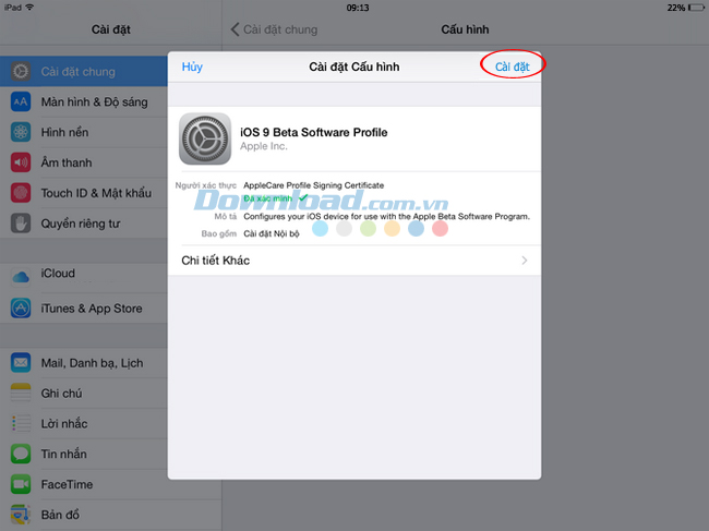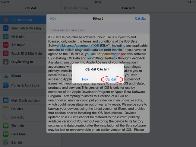 Một thông báo từ Apple Inc xuất hiện, các bạn click vào Cài đặt để xác nhận.