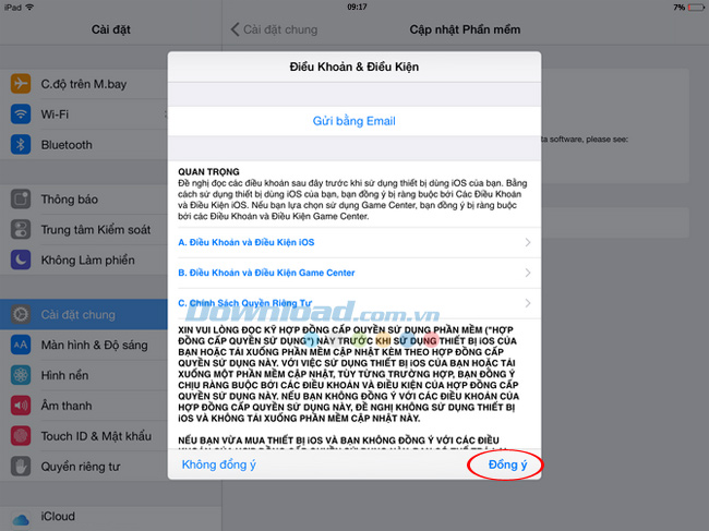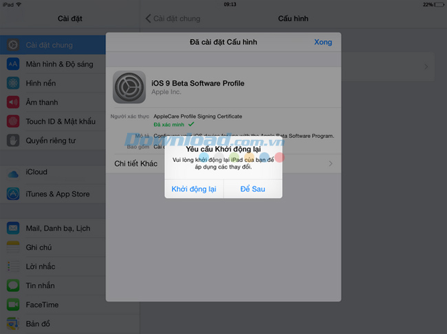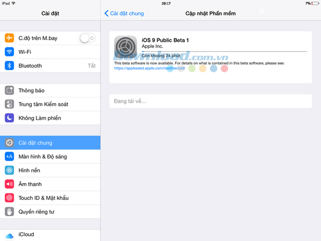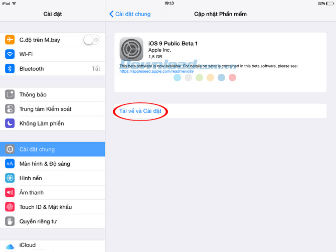 Sau khi máy được khởi động lại, các bạn nhấp vào Cài đặt (Settings) / Cài đặt chung (General) / Cập nhật phần mềm (Software Update) sẽ thấy phiên bản iOS 9 Public Beta 1 có sẵn trong đó. Chỉ cần chạm vào Tải về và Cài đặt để tiến hành. Tùy thuộc vào máy và tốc độ cũng như độ ổn định của mạng Internet mà các bạn đang dùng, thời gian tải về sẽ nhanh chậm khác nhau.
