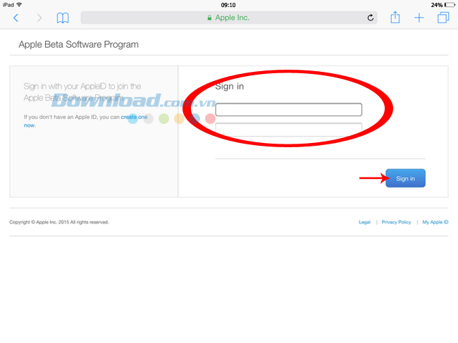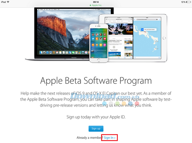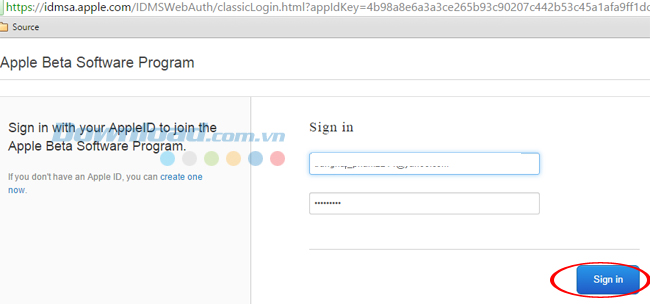 Bước 3: Các bạn vào Safari trên thiết bị iOS của mình, sau đó truy cập vào trang beta của Apple ngay trên chính thiết bị đó. Chọn vào Sign Up hoặc Sign in, sau đó nhập lại thông tin tài khoản Apple ID như lúc trước.