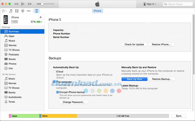 Bước 2: Một lưu ý cũng khá quan trọng khác, đó là, trước khi tiến hành thử nghiệm với phiên bản mới iOS 9, các bạn cần phải thực hiện sao lưu dữ liệu. Tại sao? Vì trong quá trình thực hiện thao tác, nếu có bất kỳ lỗi nhỏ nào xảy ra, hoặc vô tình mất kết nối, thì toàn bộ dữ liệu trong thiết bị của bạn sẽ biến mất hết. Chính vì vậy, theo Download.com.vn thì tốt nhất là các bạn nên tiến hành backup dữ liệu qua iTunes trước.