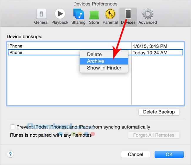 Sau khi quá trình sao lưu hoàn tất, click vào iTunes> Preferences> Devices. Tìm mục sao lưu thiết bị của mình vừa tạo, sau đó chuột phải và chọn Archive.