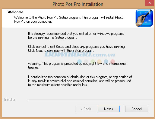 Sau đó, một cửa sổ sẽ hiển thị và hướng dẫn bạn thực hiện quá trình cài đặt Photo Pos Pro trên máy tính của mình. Vui lòng nhấn Next để tiếp tục. Xin lưu ý vui lòng đóng tất cả ứng dụng đang chạy khác trước khi tiếp tục cài đặt chương trình.