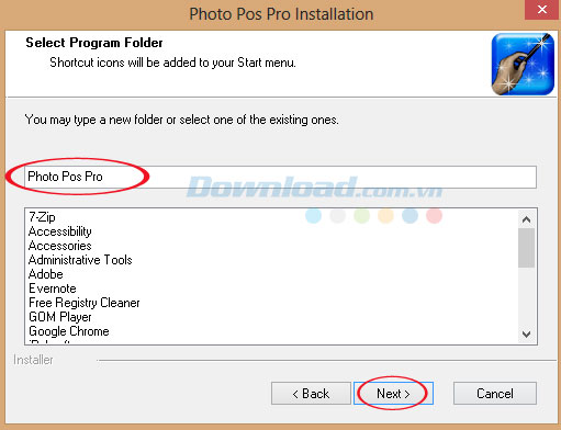 Các phím tắt sử dụng Photo Pos Pro sẽ được lưu lại vào menu Start. Bạn có thể nhập một thư mục mới hoặc sử dụng những thư mục có sẵn trong chương trình. Sau đó, bấm Next để tiếp tục.
