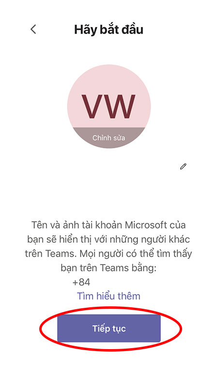 Kiểm tra tên và số điện thoại mọi người có thể dùng để tìm thấy bạn trên Teams, sau đó nhấn nút Tiếp tục.
