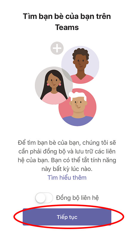 Nếu muốn tìm bạn bè từ danh bạ, tích vào ô Đồng bộ liên hệ. Nếu không, hãy bỏ qua và nhấn nút Tiếp tục.
