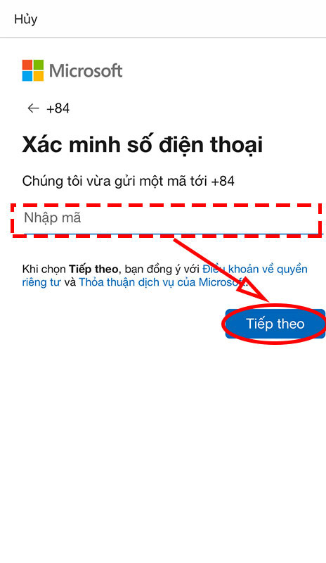 Nhập mã xác minh được gửi về số điện thoại đã đăng ký, sau đó nhấn nút Tiếp theo.