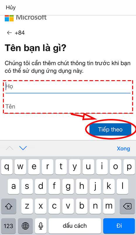 Nhập Họ, tên của bạn vào ô trống, sau đó nhấn Tiếp theo.