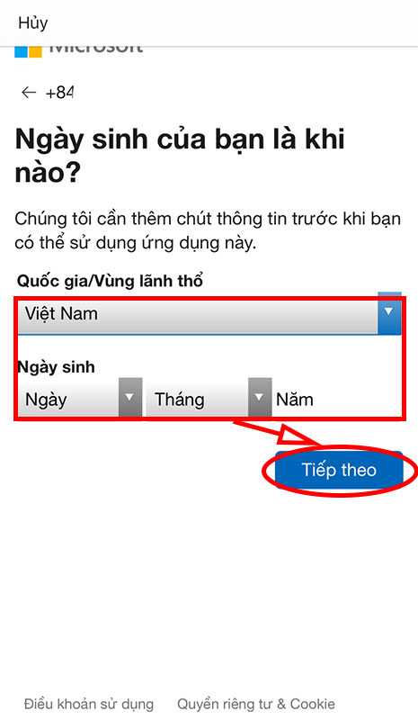 Điền ngày, tháng, năm sinh sau đó nhấn Tiếp theo.