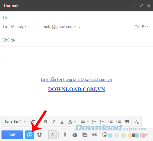 Bây giờ, nếu truy cập vào tài khoản Gmail của mình, các bạn sẽ thấy trong phần soạn thảo thư mới, sẽ xuất hiện thêm biểu tượng Mail2Cloud màu xanh, bên cạnh nút gửi.