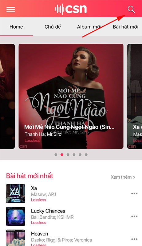 Sau khi đã tải và cài đặt, các bạn mở ứng dụng lên để bắt đầu sử dụng. Ở màn hình chính sẽ hiển thị các bản nhạc hot, bản nhạc mới hoặc các bản nhạc ngẫu nhiên. Nếu muốn nghe hoặc tải một bài nhạc cụ thể, các bạn hãy nhấn vào nút Tìm kiếm ở góc trên bên phải ứng dụng và nhập tên bài hát vào để tìm.