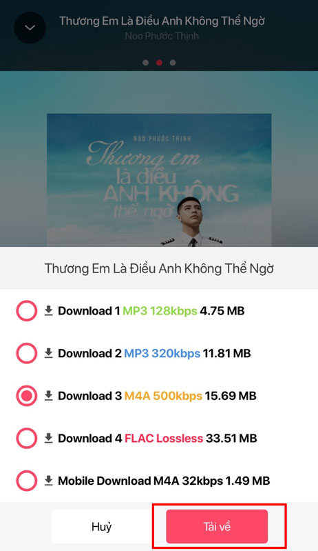Chọn một định dạng mà bạn muốn tải về sau đó nhấn nút Tải về. Lưu ý là chất lượng nhạc càng cao thì sẽ càng tốn dung lượng bộ nhớ của máy. Nhạc Lossless có thể chiếm tới vài chục MB dung lượng, nhưng chất lượng khi nghe sẽ hay hơn.
