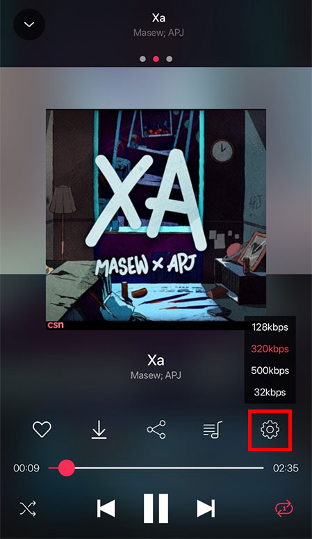 Khi đang nghe nhạc, nếu muốn đổi chất lượng nhạc hãy nhấn vào Hình bánh răng như hình dưới, sau đó chọn định dạng nhạc muốn nghe.