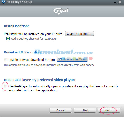 Ngoài ra, nếu muốn cài đặt RealPlayer trở thành công cụ phát video của mình, vui lòng nhấp chuột vào ô bên dưới tùy chọn Make RealPlayer my preferred video player. Sau đó, bạn có thể sử dụng chương trình để tự động mở bất kỳ video nào mà nó có thể phát, rồi nhấn Next để tiếp tục.