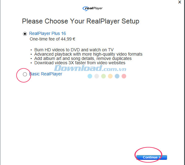 Hãy lựa chọn Basic RealPlayer để tiếp tục quá trình cài đặt và nhấn Continue.