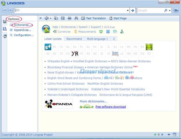 Sau khi giao diện chính của chương trình hiển thị, vui lòng bấm chuột vào mục Options và chọn Dictionaries.