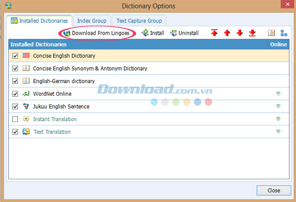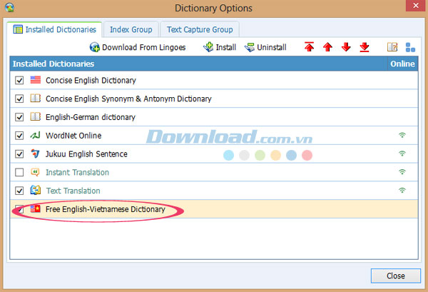 Giả sử, ở đây chúng tôi sẽ hướng dẫn bạn cài đặt từ điển Anh-Việt. Vì từ điển Anh-Việt chưa có sẵn, vì vậy vui lòng nhấp chuột vào nút Download From Lingoes để tải nó từ trang chủ của chương trình.