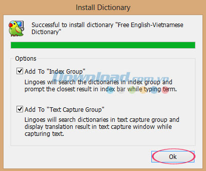 Sau đó, truy cập thư mục chứa file cài đặt Free English-Vietnamese Dictionary để tiến hành setup nó. Tiếp theo, nhấp chuột vào tùy chọn Add to Index Group và Add to Text Capture Group, rồi bấm OK.