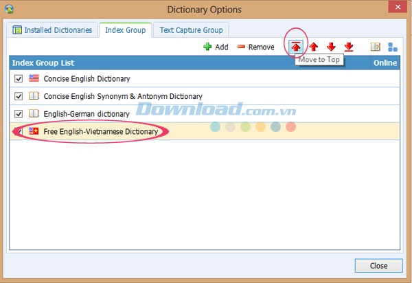 Sau đó, nhấn chuột vào Free English -Vietnamese Dictionary và bấm Move to Top để di chuyển nó lên vị trí đầu.