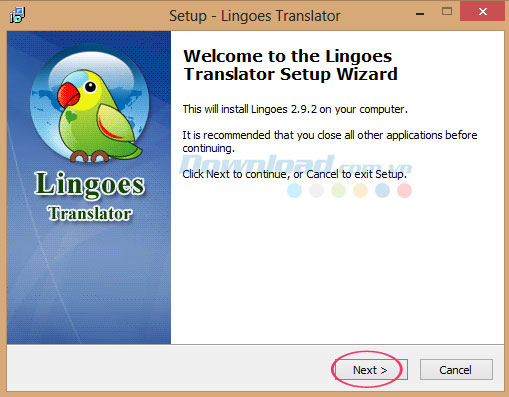 Tiếp theo, một trình thuật sĩ hỗ trợ cài đặt Lingoes sẽ hiển thị. Lúc này, bạn nên đóng tất cả chương trình khác trước khi tiếp tục. Nhấn Next để tiếp tục.