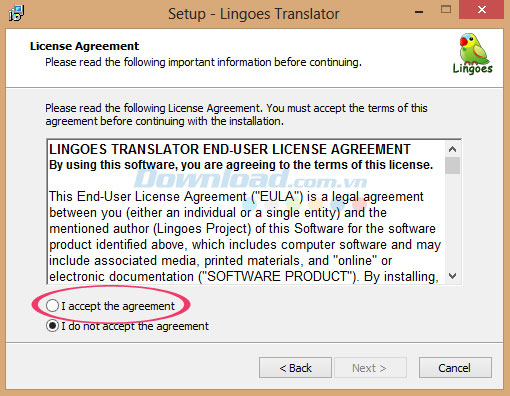 Sau đó, vui lòng đọc điều khoản sử dụng chương trình ở bên dưới. Nếu muốn tiếp tục quá trình cài đặt Lingoes, bạn phải chấp nhận những điều khoản này bằng cách nhấp chuột vào ô I accept the agreement.