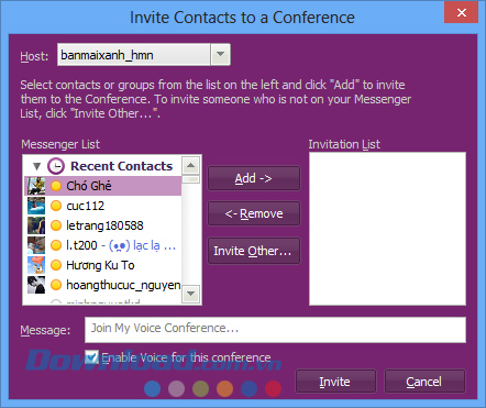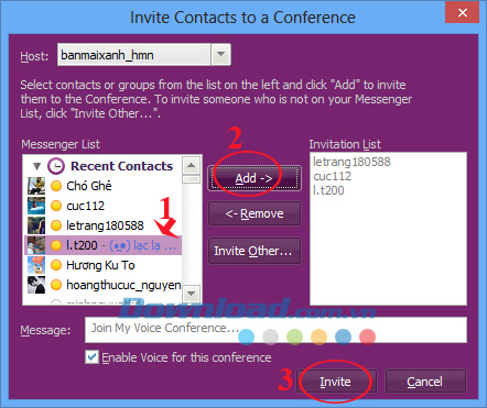 Bước 2: Cửa sổ Invite Contacts to a Conference xuất hiện cho phép bạn lựa chọn bạn bè để chat nhóm.