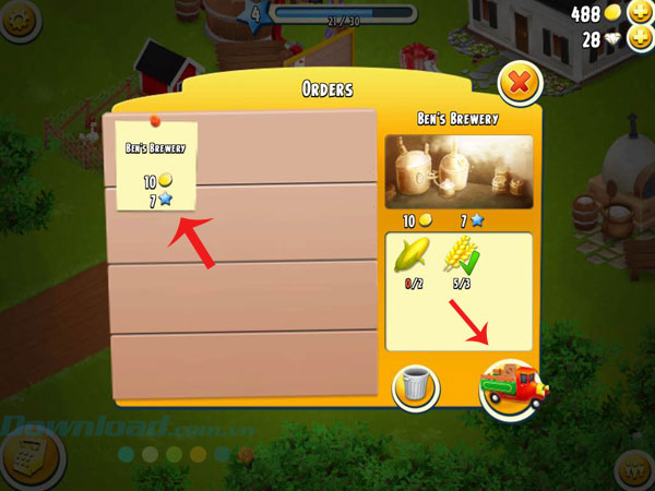 Nguồn thu chính của nông trại đến từ những chiếc xe tải mang theo đơn hàng khủng. Bạn có thể nhấn vào chiếc xe hay bảng tin bên cạnh để xem đơn hàng hôm nay là gì. Những yêu cầu trong đơn hàng có thể có sẵn trong kho để bạn bán luôn, nếu chưa có, hãy dựa vào số lượng yêu cầu để sản xuất cho đủ.