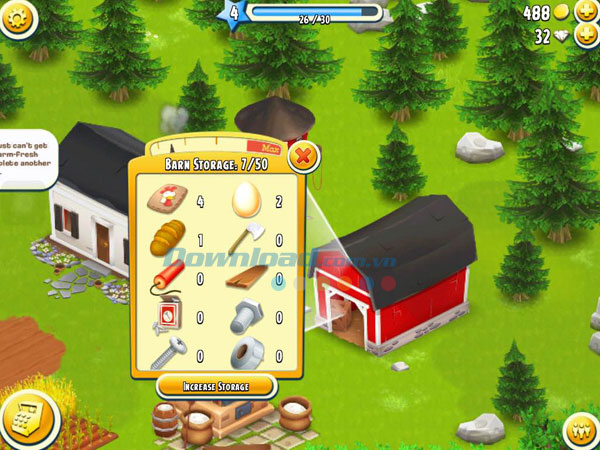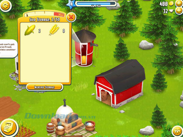 Ở những level đầu tiên, bạn sẽ được cấp miễn phí một số công trình xây dựng nhỏ như Silo - kho chứa lương thực thực phẩm đã thu hoạch, gồm lúa mì, ngô và các loại rau củ khác. Sức chứa mặc định của Silo là 50 đơn vị sản phẩm, bạn có thể tăng dung tích Silo bằng cách nhấn Increase storage bên dưới và dùng tiền để mở rộng kho chứa.