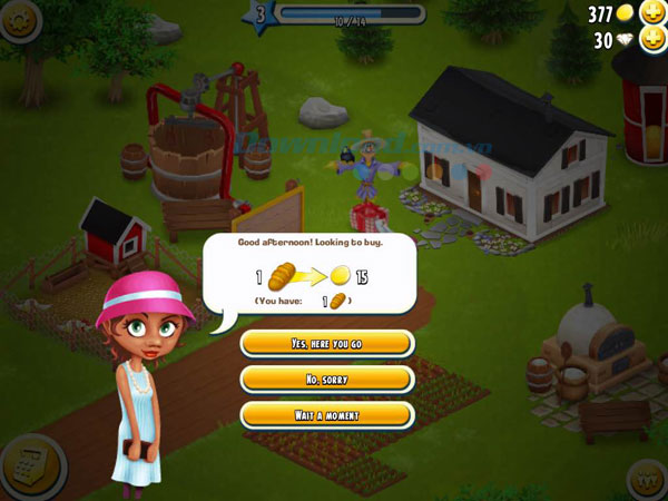 Hãy đón chào vị khách thứ 2 đến với nông trại Hay Day của bạn. Cô gái xinh xắn này có nhu cầu mua bánh mỳ với giá 15 đồng tiền vàng cho một ổ bánh. Đây là dạng khách lẻ của nông trại, nhấn Yes, here you go để bán bánh mỳ cho cô gái ngay lập tức. Nhấn No, sorry nếu bạn không muốn hoặc Wait a moment nếu bạn chưa sẵn sàng.