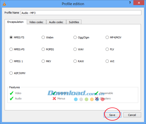 Cửa sổ Profile edition xuất hiện, lựa chọn định dạng phù hợp với thiết bị của bạn. Sau đó nhấn Save để lưu lại thiết lập.
