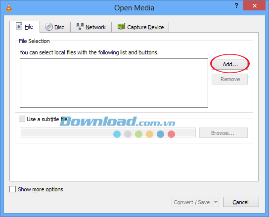 Bước 2: Cửa sổ Open Media xuất hiện, nhấn vào nút Add để thêm video muốn chuyển đổi.