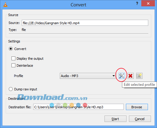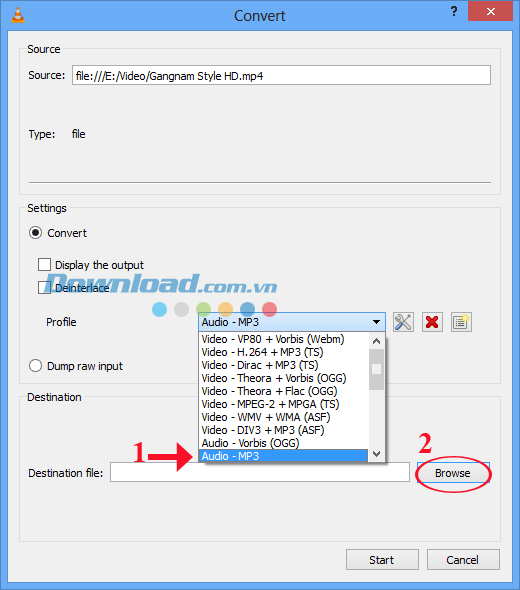 Bước 4: Tại mục Profile bạn chọn định dạng đầu ra cho video. Còn ở mục Destination file nhấn vào nút Browse để chọn đường dẫn lưu file sau khi chuyển đổi xong.
