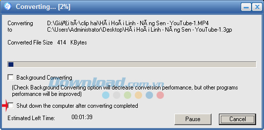 Bước 5: Quá trình chuyển đổi đang diễn ra, hãy đợi 1 lát khi nào tiến trình chạy được 100% là kết thúc, quá trình này còn phụ thuộc vào dung lượng cũng như cấu hình máy tính của bạn nữa. Còn nếu muốn tắt máy ngay sau khi chuyển đổi hoàn tất thì tích chọn vào ô Shut down the computer after converting completed.
