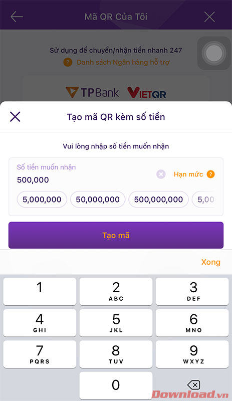 Nhập số tiền muốn nhận sau đó nhấn nút Tạo mã.