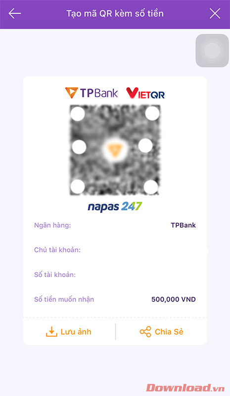 Sau khi tạo mã thành công, màn hình QR code sẽ hiện ra. Lúc này các bạn chỉ cần chụp lại màn hình và gửi cho người muốn chuyển tiền cho bạn là xong. Mã QR này đã bao gồm đầy đủ thông tin về tài khoản của bạn và số tiền muốn nhận.