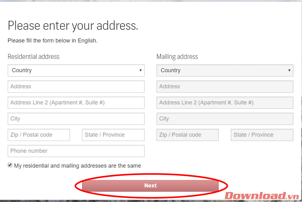 Công đoạn tiếp theo chúng ta cần điền địa chỉ liên lạc. Bạn chỉ cần điền ở phần Residential address sau đó tích vào dòng My residential and mailing addresses are the same thì thông tin địa chỉ của bạn cũng sẽ được áp dụng cho hòm thư bưu điện của bạn. Nên để địa chỉ thật để nếu có xảy ra khiếu nại thì dễ dàng giải quyết. Các bạn điền lần lượt từ trên xuống: