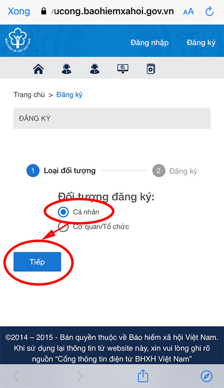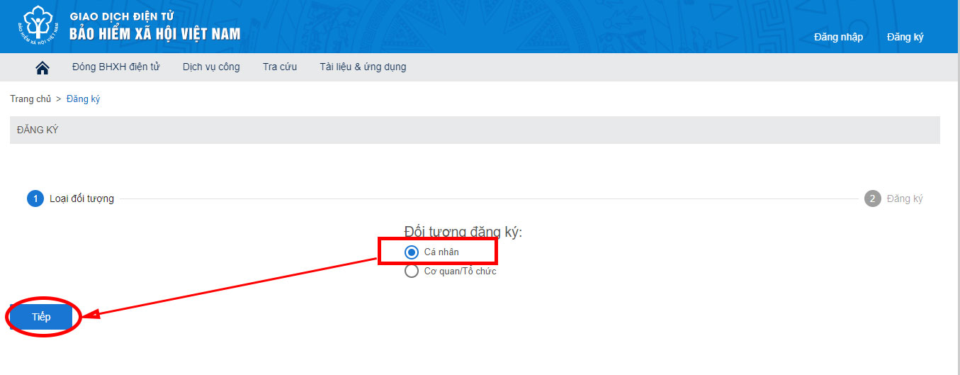 Đầu tiên các bạn truy cập vào trang web: https://dichvucong.baohiemxahoi.gov.vn/#/dang-ky, tích chọn vào ô Cá nhân sau đó nhấn Tiếp.