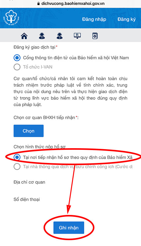 Ở phần hình thức nộp hồ sơ các bạn tích chọn vào Tại nơi tiếp nhận hồ sơ theo quy định của Bảo hiểm Xã hội Việt Nam. Sau khi hoàn thành việc điền tờ đơn, các bạn nhấn nút Ghi nhận.