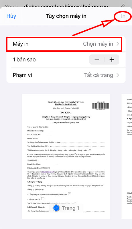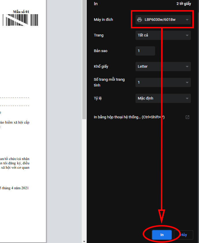 Chọn nút In sau đó chọn máy in của bạn và nhấn nút In ở góc bên phải để in tờ đơn.