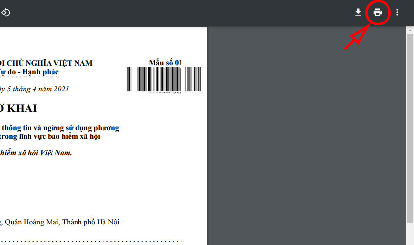 Sau khi nộp hồ sơ thành công, các bạn sẽ nhận được tin nhắn từ tổng đài của BHXH Việt Nam thông báo về hồ sơ của bạn. Đồng thời các bạn cũng sẽ được chuyển đến file pdf chứa nội dung tờ đơn vừa mới điền. Ta cần in tờ đơn này ra, ký và nộp cho cơ quan BHXH nơi đăng ký. Để in tờ đơn các bạn nhấn vào nút hình máy in ở góc trên bên phải màn hình.